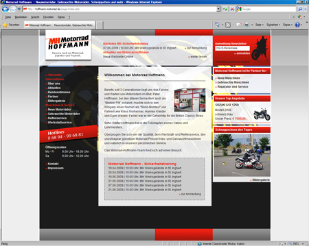 Unternehmen » Über uns » Aktuelles » Kundenstimmen » Partner » Bildergalerie Auto & Motorrad » Neue Motorräder » Gebrauchte Motorräder » Reifenservice » Werkstattservice Neue Webseite OnlineAm Freitag den 12. Juni 2009 ist die neue Webseite von Motorrad Hoffmann online gegangen. Wir wünschen Ihnen viel Spaß und viel Freude beim stöbern auf der neuen Seite. Bei Fragen oder Anregungen bitten wir Sie uns zu kontaktieren. Ihr Motorrad Hoffmann-Team